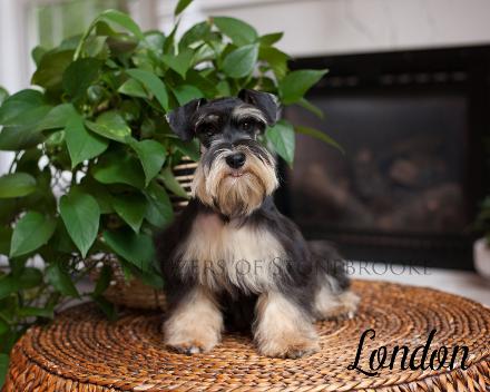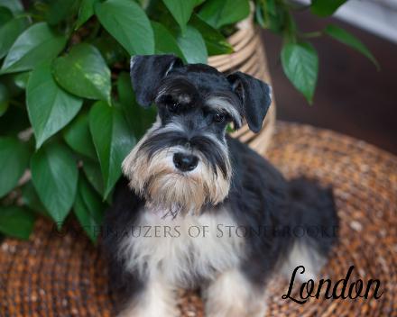 London is a Black & Silver Miniature Schnauzer girl. She is registered with The American Kennel Club and weighs 12 pounds.
