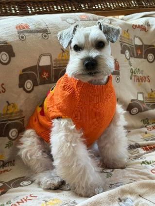 "Here are some recent photos of Boomer (originally Jett). We love him to the moon and back! We get so many compliments on him...especially since he is white (and so sweet)...most folks have no idea that Schnauzers can come in colors besides the breed standards.